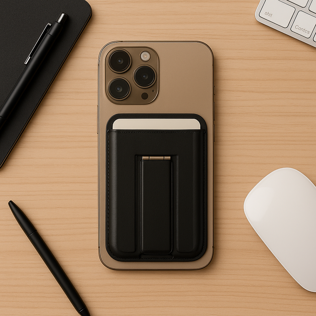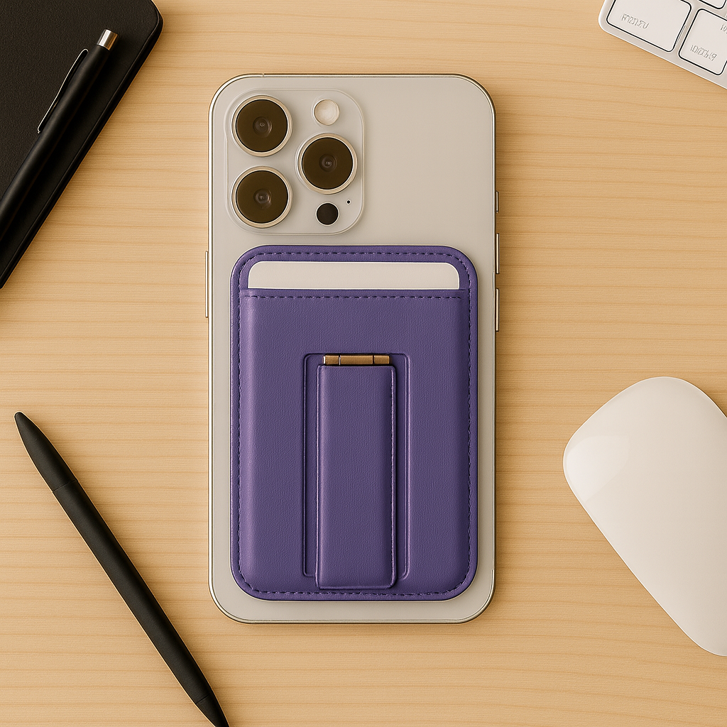 Introducing the MagSafe leather Wallet Stand, a premium 2-in-1 accessory that snaps securely to your iPhone and transforms into a kickstand whenever needed. Carry your cards and cash effortlessly, while enjoying hands-free viewing at any time.
